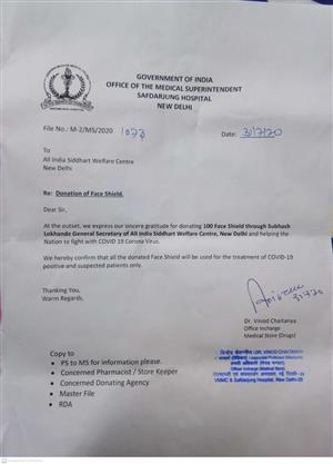 certificate for donate plastic shield to Safdarjung Hospital, New Delhi